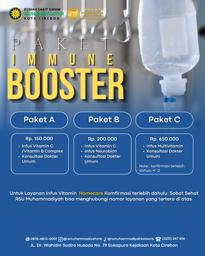 RSU Muhammadiyah Kota Cirebon menyediakan layanan medis, termasuk infus vitamin, sebagai bagian dari terapi untuk meningkatkan daya tahan tubuh dan kesehatan secara umum. Layanan infus vitamin ini ditujukan bagi mereka yang ingin menjaga kebugaran, mempercepat pemulihan setelah sakit, atau sebagai upaya pencegahan penyakit.